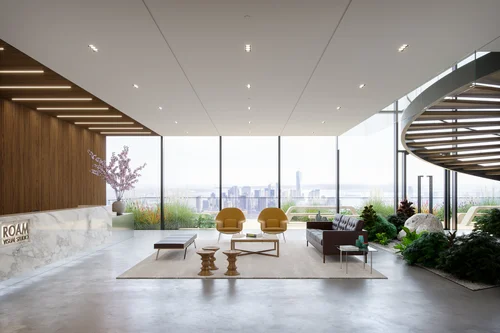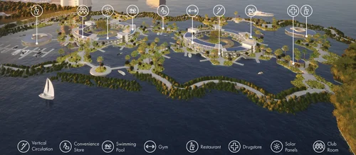 Supporting pavilions provide access to essential services: convenience stores, drugstores, and co-working spaces, all designed to sustain daily life on the water.